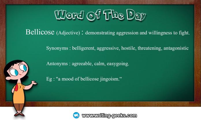 Synonyms : belligerent, aggressive, hostile, threatening, antagonistic.