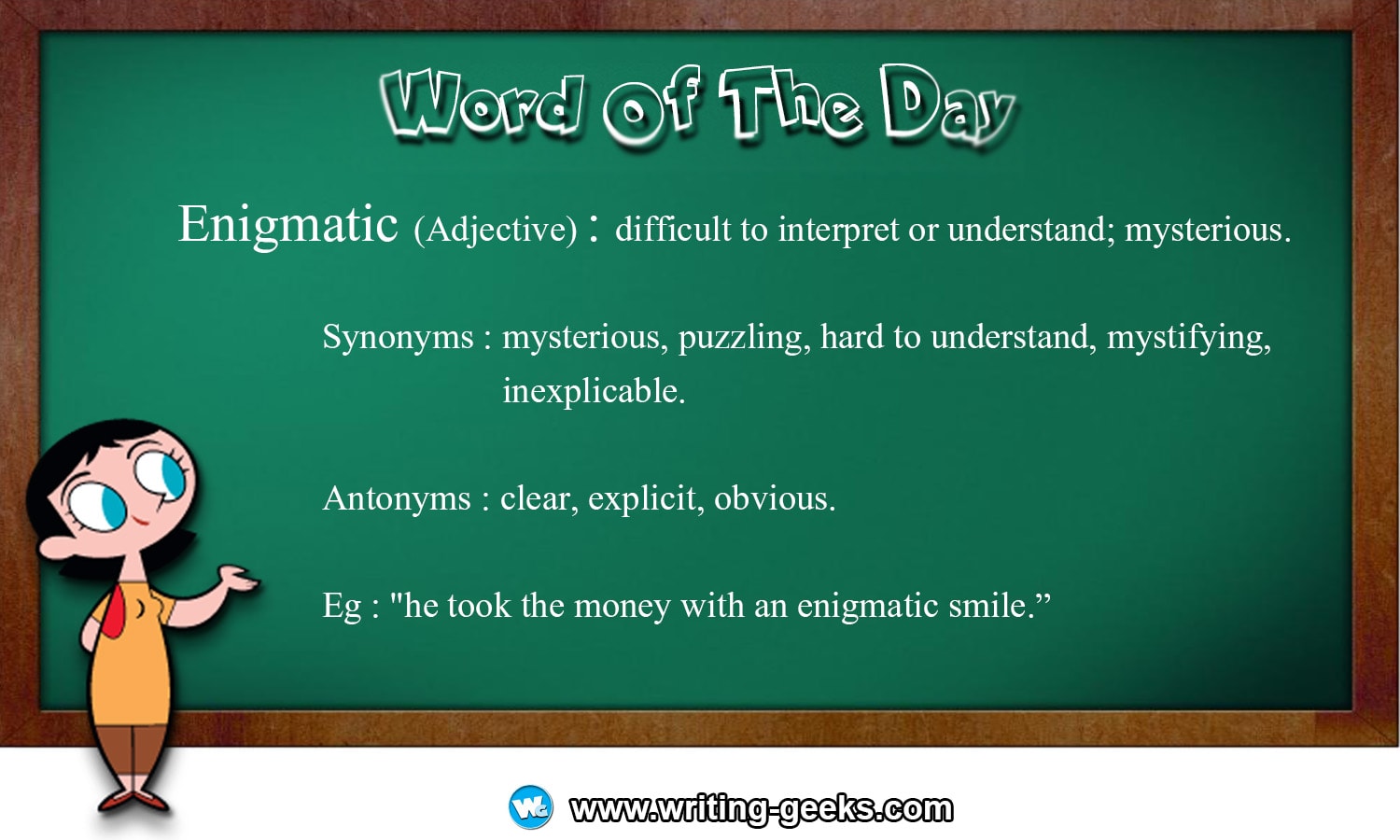 Eg : “he took the money with an enigmatic smile.”