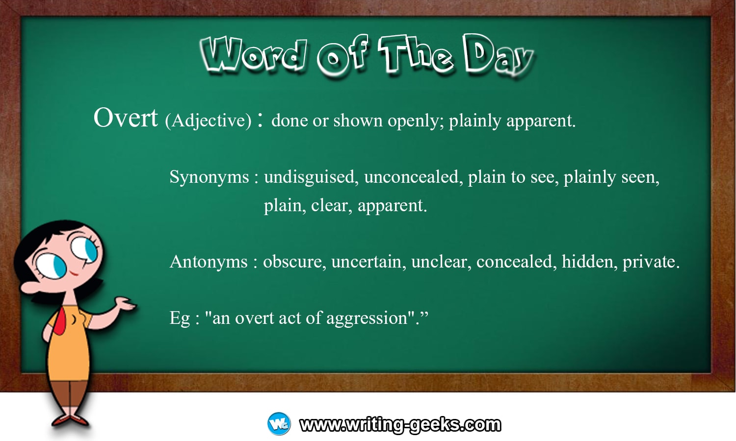 Overt (Adjective) : done or shown openly; plainly apparent.