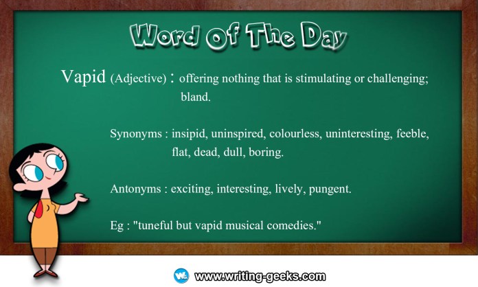 Vapid (Adjective) : offering nothing that is stimulating or challenging; bland.